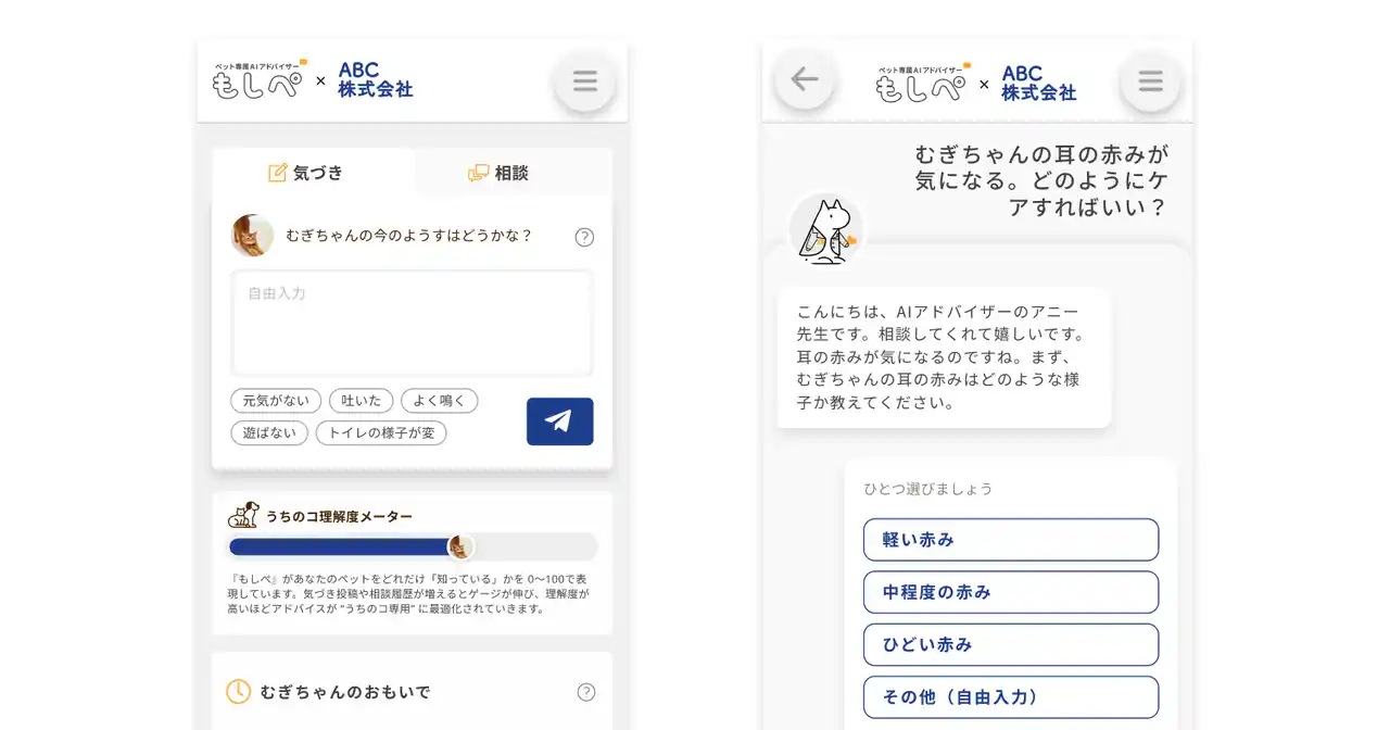 『もしぺ』は、累計68万回以上の相談実績を通じて、飼い主のリアルな不安や行動データを蓄積してきました。 その分析により、「ペットの健康不安の解消」は法人が保有する顧客接点においても極めて重要なニーズであり、継続率や満足度に直結する領域であることが明らかになりました。 これらの示唆を踏まえ、事業方針の転換を決定しました。 |