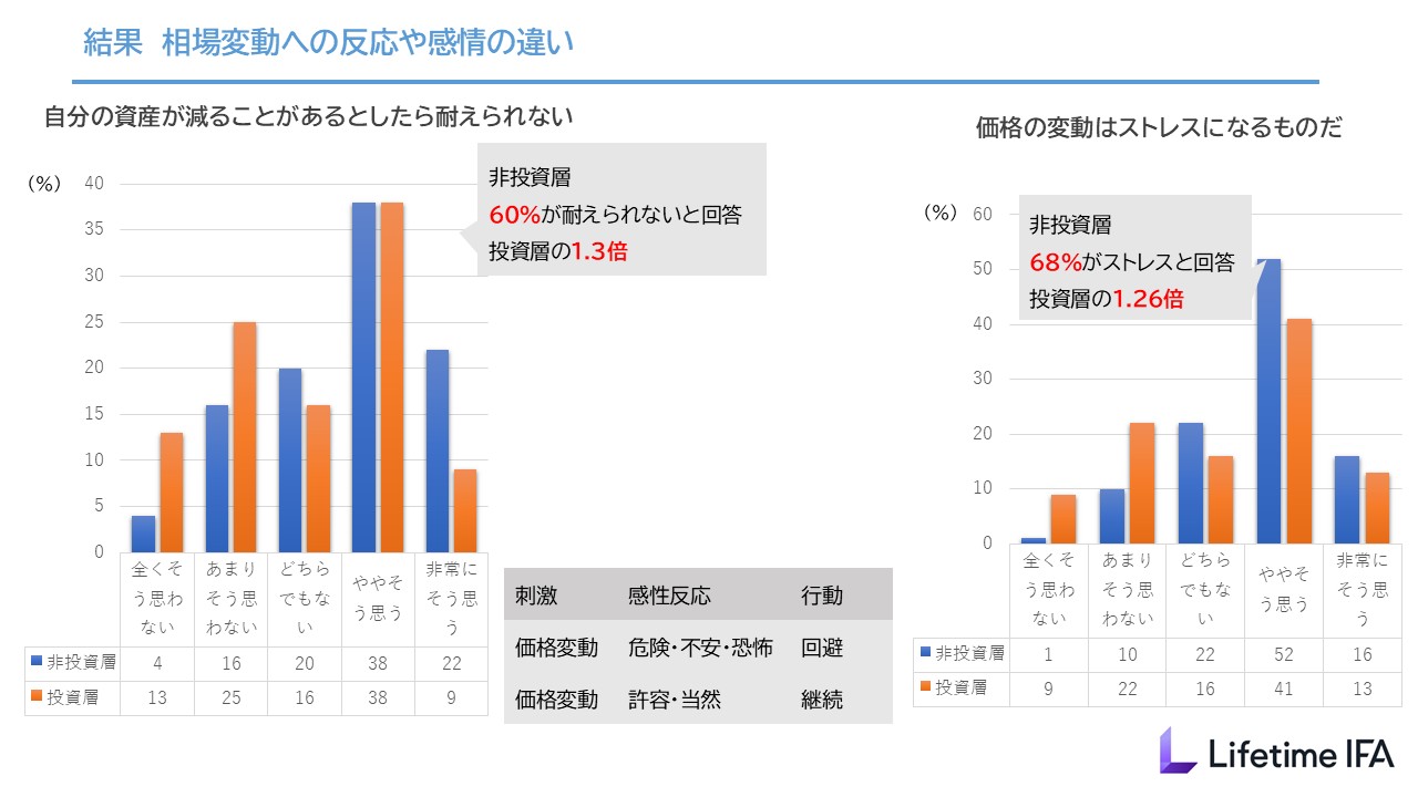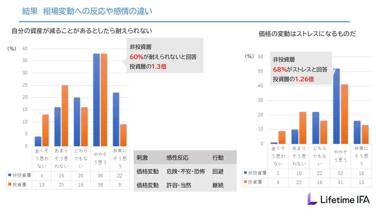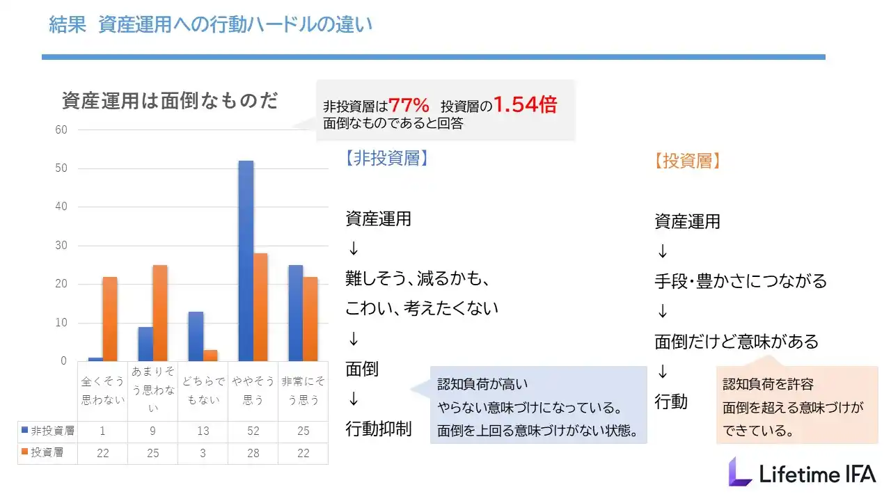 Lifetime IFA金融研究チーム(ジャパンウェルスアドバイザーズ株式会社運営/所在地:東京都中央区、代表取締役社長:八代 幹雄)は、投資をする人としない人の違いに着目し、投資をしていない人(以下、非投資層)が投資行動へ向かうにあたって必要なアプローチについて、感性工学的観点から調査研究を実施しました。