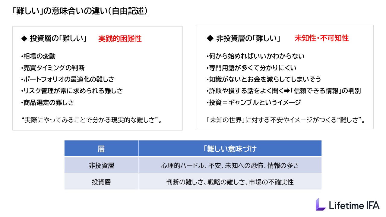 非投資層と投資層の「難しい」の意味合いの違い(自由記述)