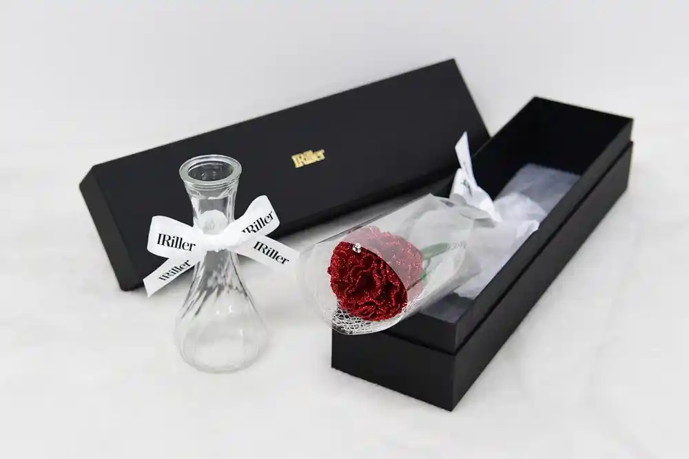 商品名:グリッターカーネーション 用途:母の日ギフト 箱のサイズ:幅約90mm 高さ90mm 長さ約360mm 販売開始:2026年4月6日~ 母の日シーズン期間中 販売場所:IRiller公式オンラインストア |