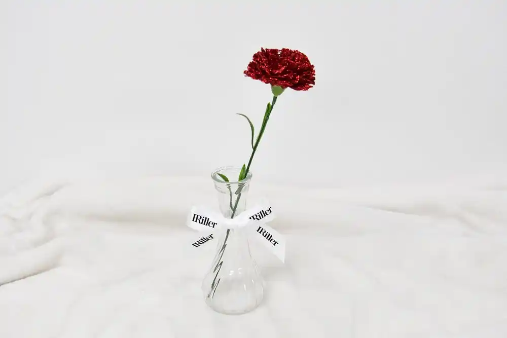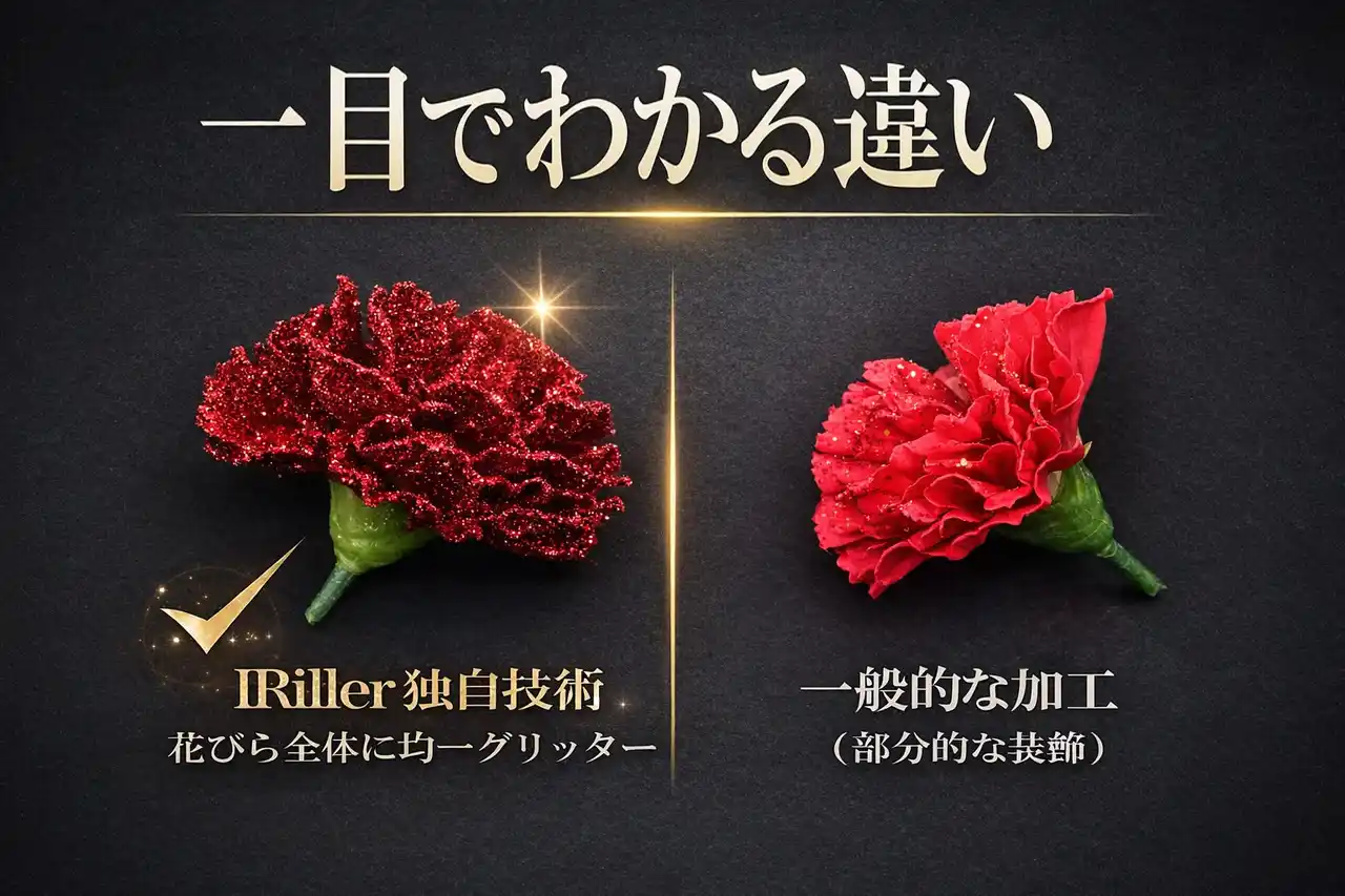 一方、IRillerのグリッターカーネーションは、 すべての花びらに均一にグリッターを施すことで、どの角度から見ても美しく輝く仕上がりを実現しています。 |