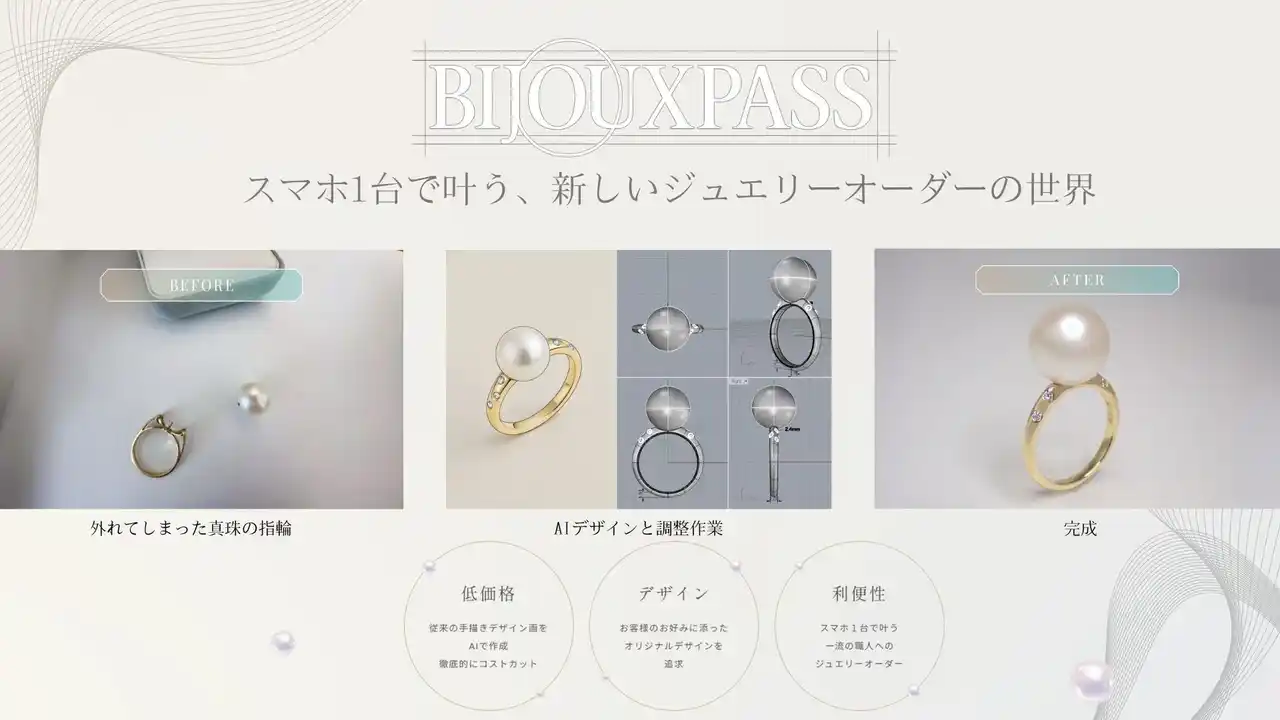 株式会社BIJOUXPASS(所在地:大阪市中央区、代表取締役:結城晋江)は、日本の宝飾職人とお客様をオンラインで直接つなぐジュエリーリフォームに特化したプラットフォーム「BIJOUXPASS(ビジュパス)」のサービス受け付けを4月10日より開始します。 |
