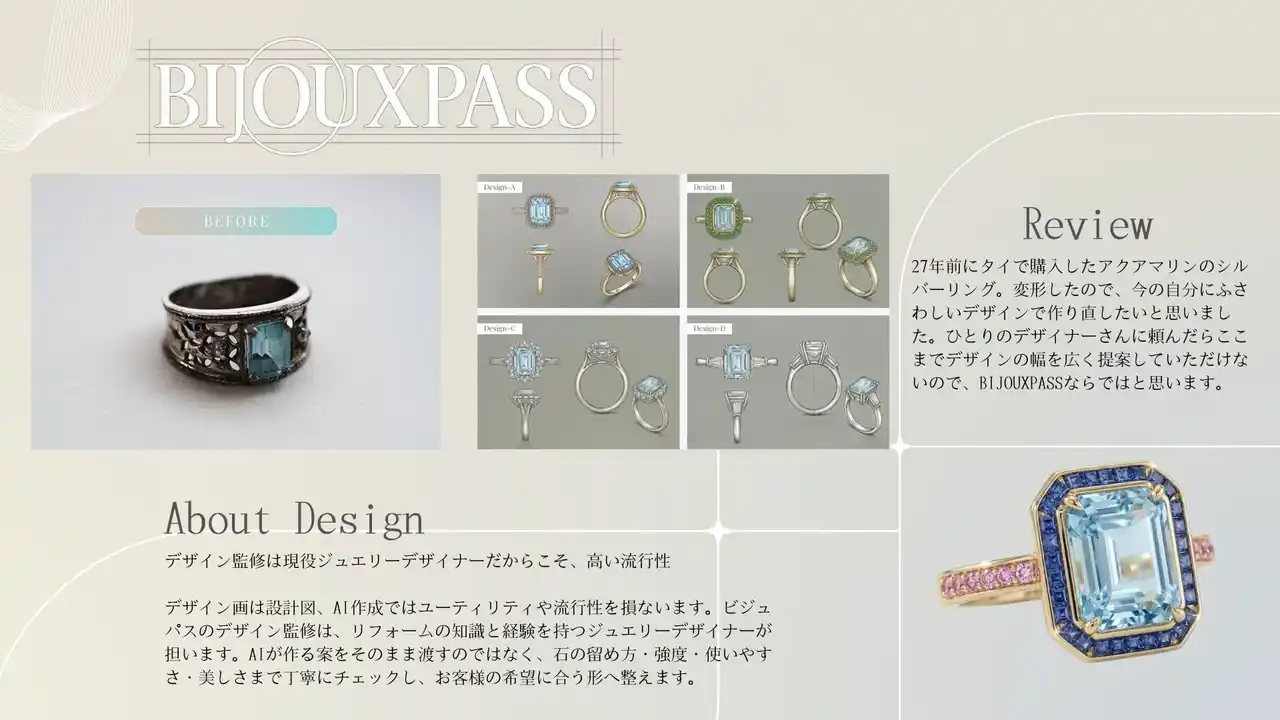 女性が声をあげにくい祖母や母の時代、宝石は女性に許された自分らしさを体現する数少ないアイテムでした。たくさんの幸せな思い出や、ときに自分を鼓舞するため、大事な想いが込められた宝石たち。ところが委託先探しの困難さや、金額の壁などで、安く手放されていく今の潮流に胸が痛んでおりました。ビジュパスでは、自分らしいデザインの自由さを保ちつつも、低価格なリフォームサービスをご提供します。そして宝石と共に、家族の記憶や愛の思い出を次世代へ引き継ぐお手伝いをしたいと思い、プラットフォームを立ち上げました。 |