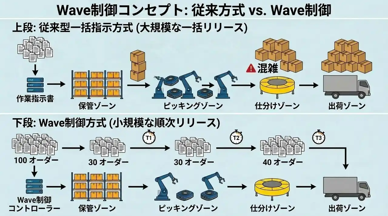 従来は出庫・仕分け工程が中心であったWave制御を、出荷工程の作業まで拡大しました。 |
