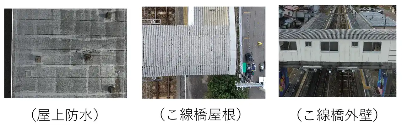 本検証では、駅設備ごとの点検項目・判定基準を踏まえ、撮影条件を整理した上で、ドローンの自動航行により建物上空から屋根や壁面といった対象物を撮影し、画像解析を行うことにより劣化箇所を抽出する一連の手順を実施しました。あわせて、自動航行によるデータ収集が点検業務の効率化や同一ルート・同一角度での撮影再現性の確保に有効であるか、さらに画像解析に必要な品質を満たした画像が取得できているかを検証しました。 |