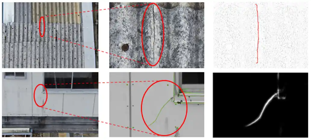 外壁のひび割れ検出において、画像解析によりひび割れを含む変状箇所を大まかに抽出できることを確認しました。さらに、抽出結果に対して追加の解析処理を行うことで、さらに明瞭に捉えることが可能であることを確認しました。これらを組み合わせることで、ひび割れの検出精度を向上させられることが示されました。 |