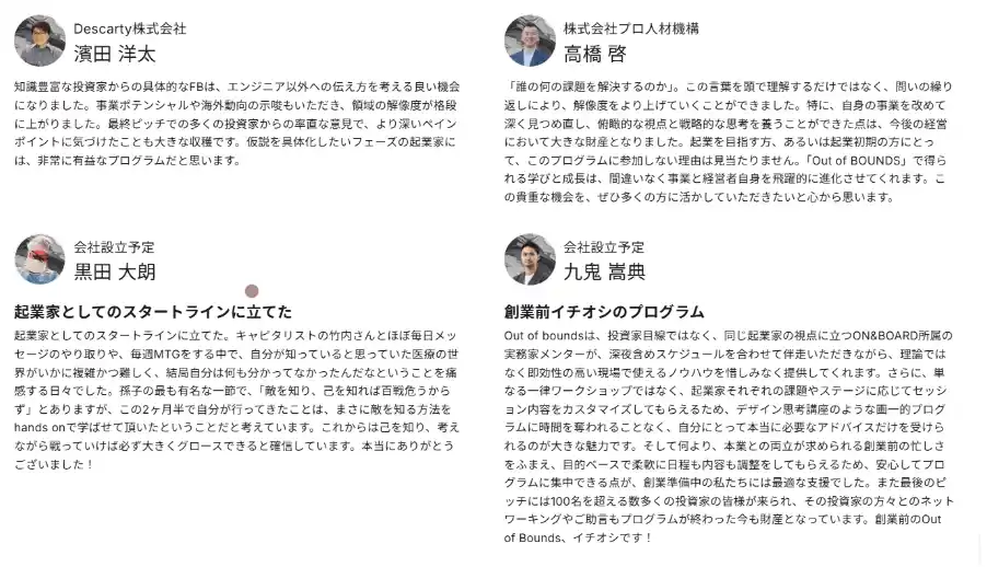 ON&BOARD内には、日本初グローバル・大手IT企業で事業開発等経験者、数千億円規模でのスタートアップのエグジット経験を有する現役の社長、戦略コンサルタント、多数のトラックレコードがあるベンチャーキャピタリスト、プロダクトマネージャー、エンジニア、AI研究者、弁護士、薬剤師、公認会計士、採用・人事、組織作り等の専門家等がおり、創業に必要なリソースを提供します。 |