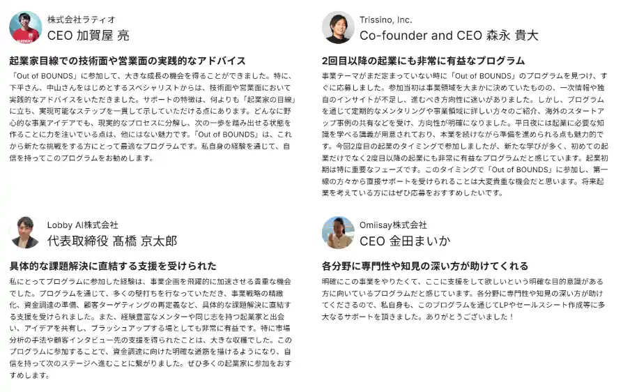 「Out of BOUNDS」は、“これまでの常識や境界を超え、新たな未来を切り拓く”という想いを込めた創業支援プログラムです。挑戦者がリスクを恐れずに自ら限界を押し広げ、社会を大きく変革するユニコーン企業への成長を目指し参加チームの皆様と伴走してきました。 |