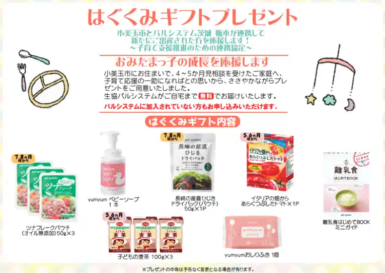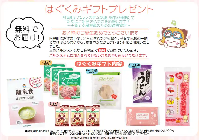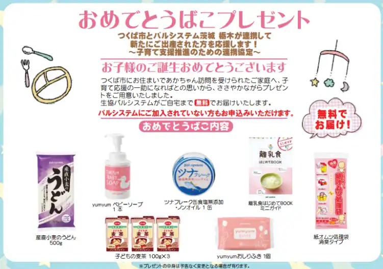 協定書に基づき各行政は、保健師や助産師による赤ちゃん訪問や乳児健診時に、出生祝いとして育児用品を詰め合わせた「おめでとうばこ」や「はぐくみギフト」の案内カードを配付します。出生祝いは、パルシステムオリジナル商品の食材やおしりふき、離乳食づくりに役立つミニガイドなどを詰め合わせます。 |