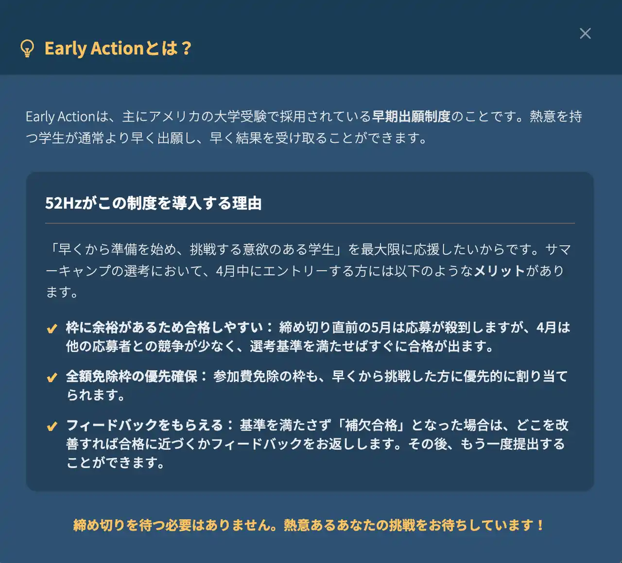 キャンプ参加・全額免除枠の優先確保: 応募が殺到する5月の締め切り直前と比べ、枠に余裕がある4月は選考基準を満たせばすぐに合格が出やすくなります。参加費免除の枠も、早くから挑戦した方に優先的に割り当てられます。 |