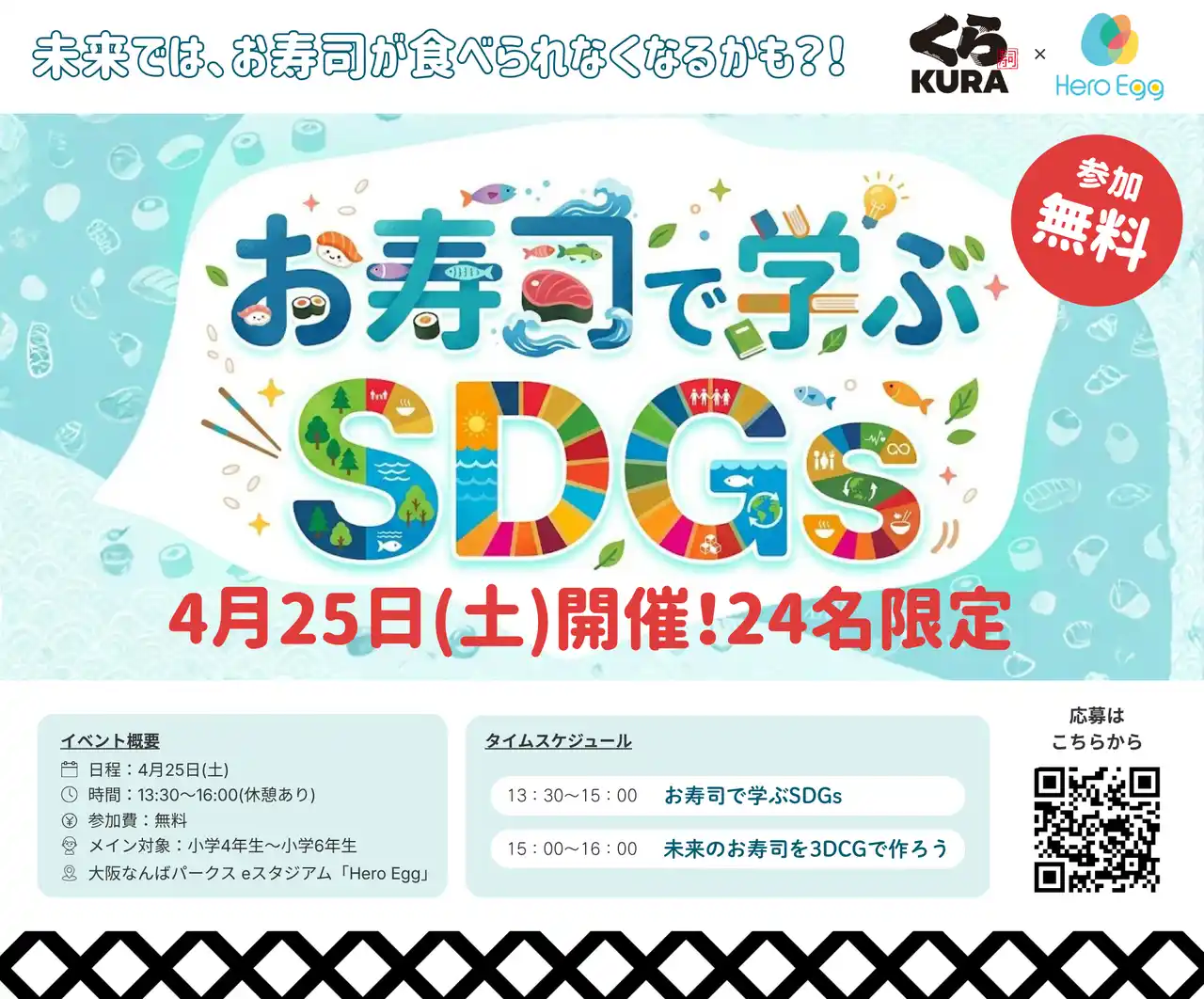 株式会社Meta Heroes(本社所在地:大阪府大阪市、代表取締役:松石和俊、以下「当社」)は、当社が運営するDX教育施設「Hero Egg(ヒーローエッグ)」において、回転寿司チェーン「くら寿司」を展開しているくら寿司株式会社(本社所在地:大阪府堺市、代表取締役社長:田中邦彦、以下「くら寿司」)とのコラボレーションによる体験型学習イベント「お寿司で学ぶSDGs」を2026年4月25日(土)に開催いたします。 |