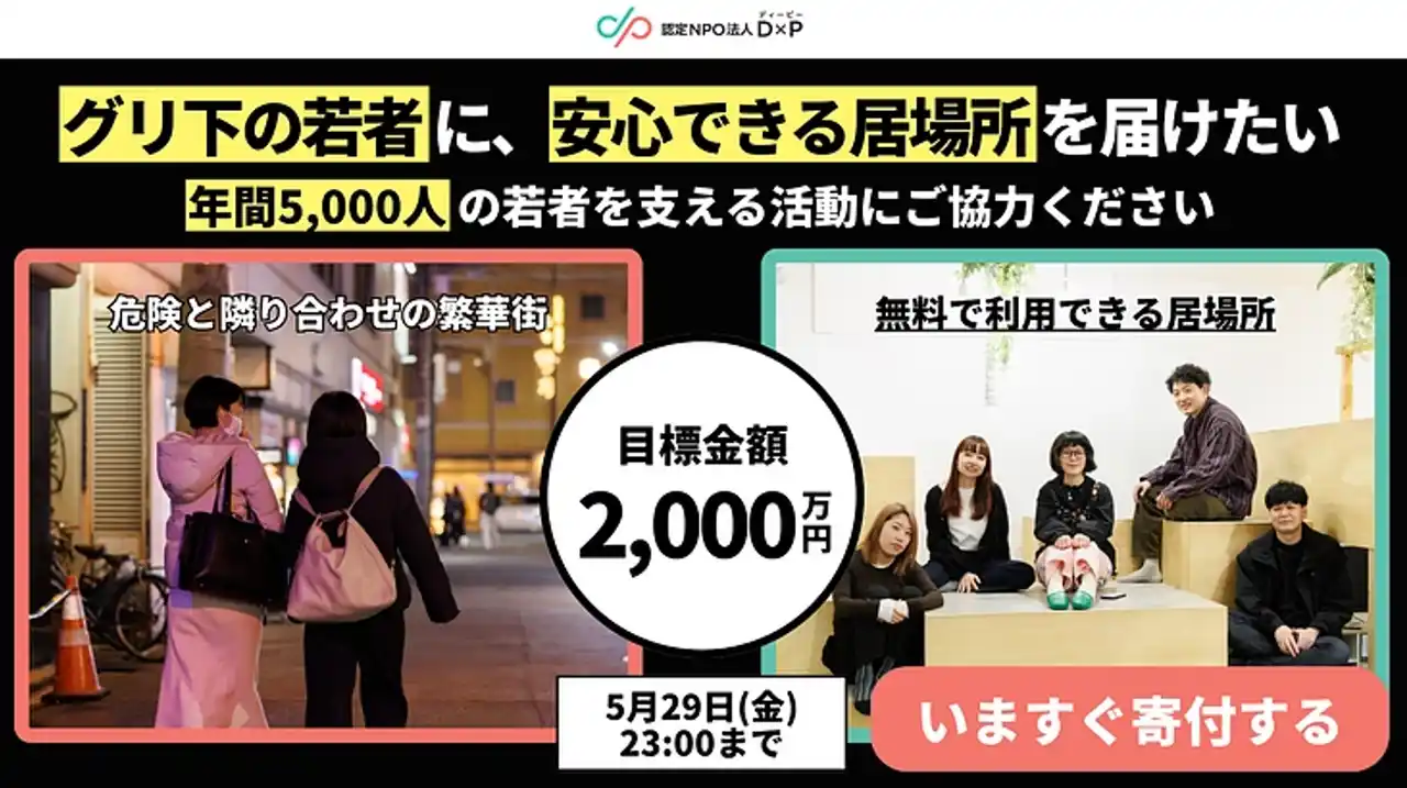 孤立するユース世代の支援を行う認定NPO法人D×P(ディーピー)(大阪市中央区、理事長:今井紀明 以下D×P)は、クラウドファンディングサービス「READYFOR」にて、大阪・道頓堀周辺(通称:グリ下)に集まる居場所のない若者を支援する「ユースセンター」の2026年度運営費を2026年4月7日(火)から5月29日(金)まで支援を募ります。
