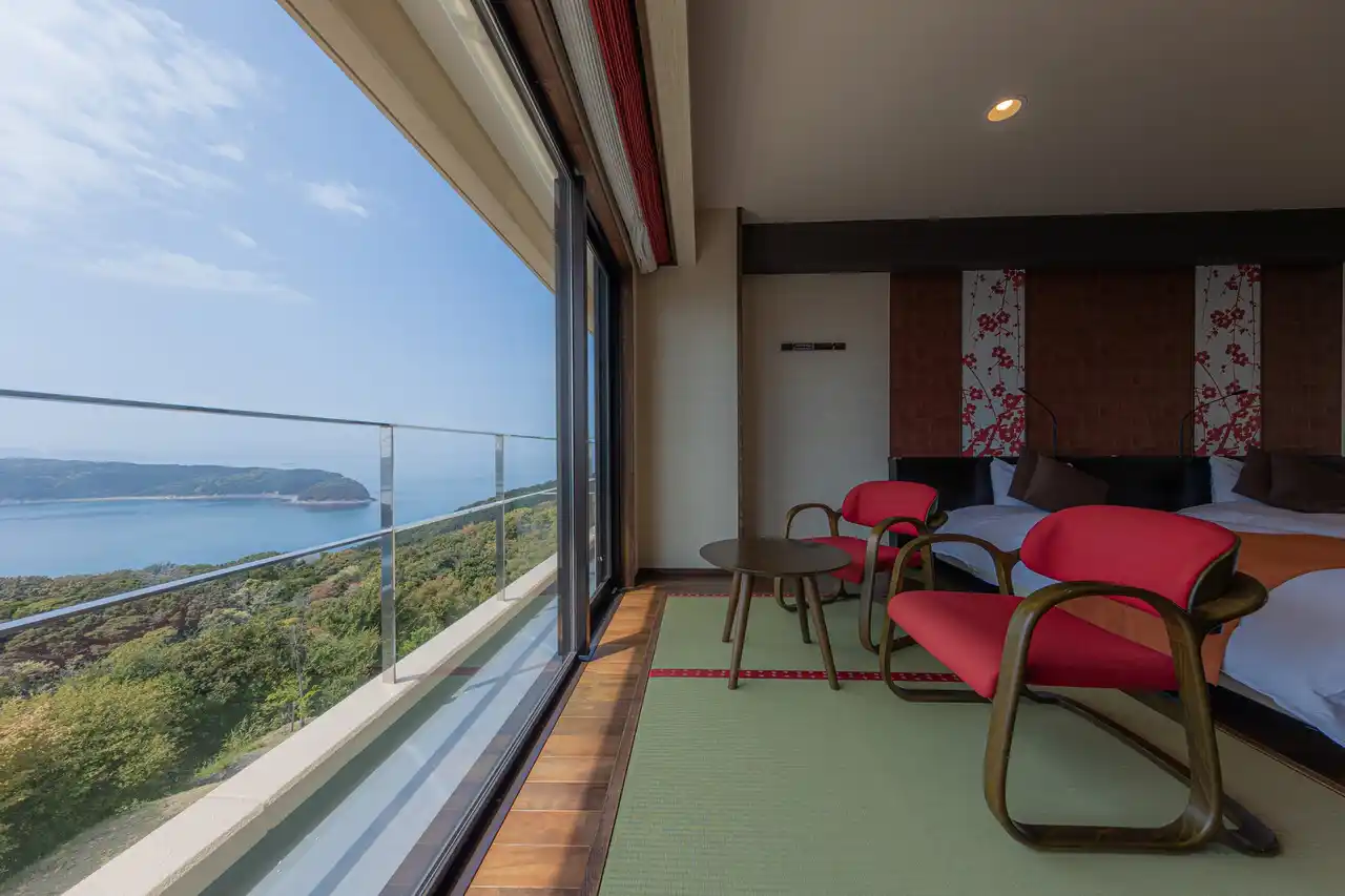 紀淡海峡に浮かぶ島々を一望する絶景のホテルです。客室は全室オーシャンビュー、特に夕景の美しさは別格です。また、春の桜鯛、夏のハモ、秋の伊勢海老、冬のクエ等、四季を通して海の幸も楽しめます。自慢の露天風呂は、紀淡海峡と湯面が一体化する趣向で人気があります。敷地内の深山砲台跡をはじめ、アニメファンに話題の友ヶ島もすぐそこにあり、周辺フィールドも見所沢山です。 |