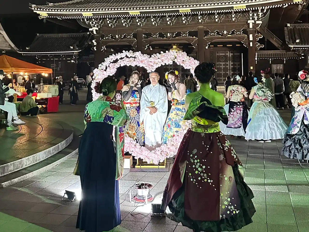 今回のテーマ「夜桜で乾杯」を象徴する演出として、会場内に桜のハート巨大モニュメントを設置します。東本願寺前という象徴的なロケーションの中で、来場者が思い出を残せる春限定のフォトスポットです。カップル、友人同士、家族連れ、観光客まで幅広く楽しめる"画になる"演出として、会場の賑わいをさらに高めます。 |