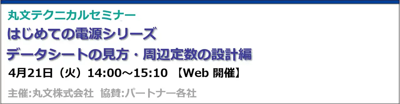 エレクトロニクス商社の丸文株式会社(代表取締役社長 兼 CEO︓堀越裕史、本社: 東京都中央区、以下、丸文)は、4月21日(火)に電源ICのデータシートの読み方に関してのポイントや注意点などについて解説する無料のオンラインセミナーを開催します。 |