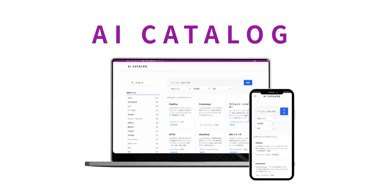 | AIサービスやAIベンダーを検索できる協会公式データベース AI CATALOG も同時に公開いたしました。AI導入を検討する企業が、自社の課題、業種、用途に応じてサービスを比較検討しやすくすることを目的としたプラットフォームです。 | |||