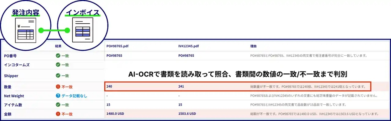 貿易書類の照合作業工数を約50%削減 AIインボイス照合機能を活用し、メーカーごとに異なる書類フォーマットの確認作業を自動化・標準化。作業時間の最大50%削減に加え担当者の心理的負担も大幅に軽減。 |