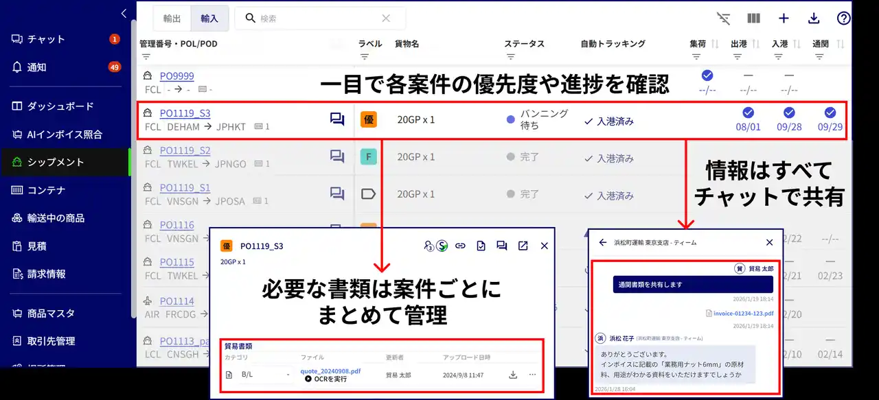 情報共有・検索コストの極小化 案件単位ですべての書類や進捗をShippio Platformへ集約し、社内メンバー・社外へのゲストアカウント発行により情報共有・連絡・管理をShippio Platformに一元化。社内外を巻き込んだ能動的な連携体制を構築。 |