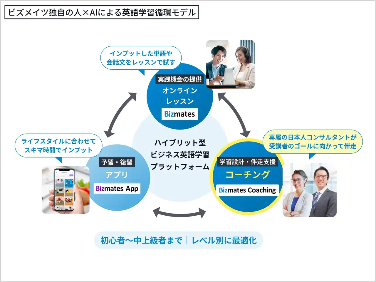 ビジネス特化型オンライン英会話「Bizmates(ビズメイツ)」を展開するビズメイツ株式会社(本社:東京都千代田区、代表取締役社長:鈴木伸明、以下「当社」)は、2026年4月6日、オンライン英会話とコーチングの受講生プラットフォームを統合しました。 |