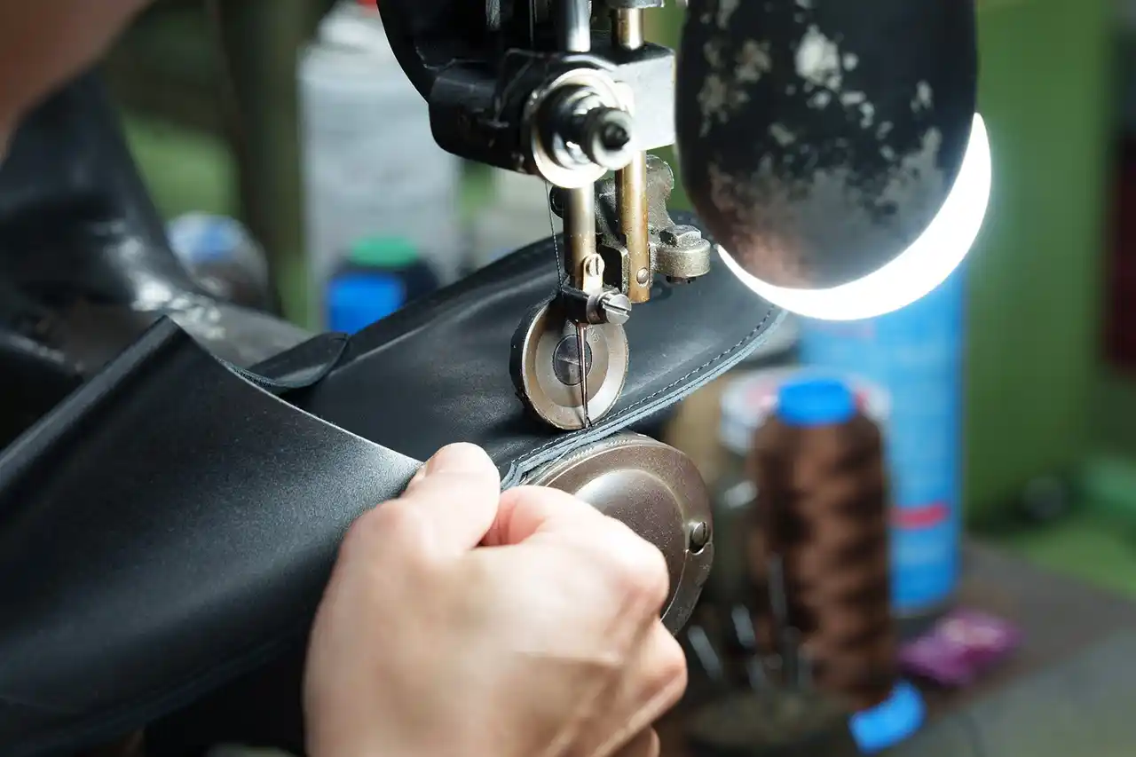 紳士靴づくりを10年近く担当しているベテラン職人により縫製します。ひとつひとつ丁寧にミシンで縫っていきます。 |
