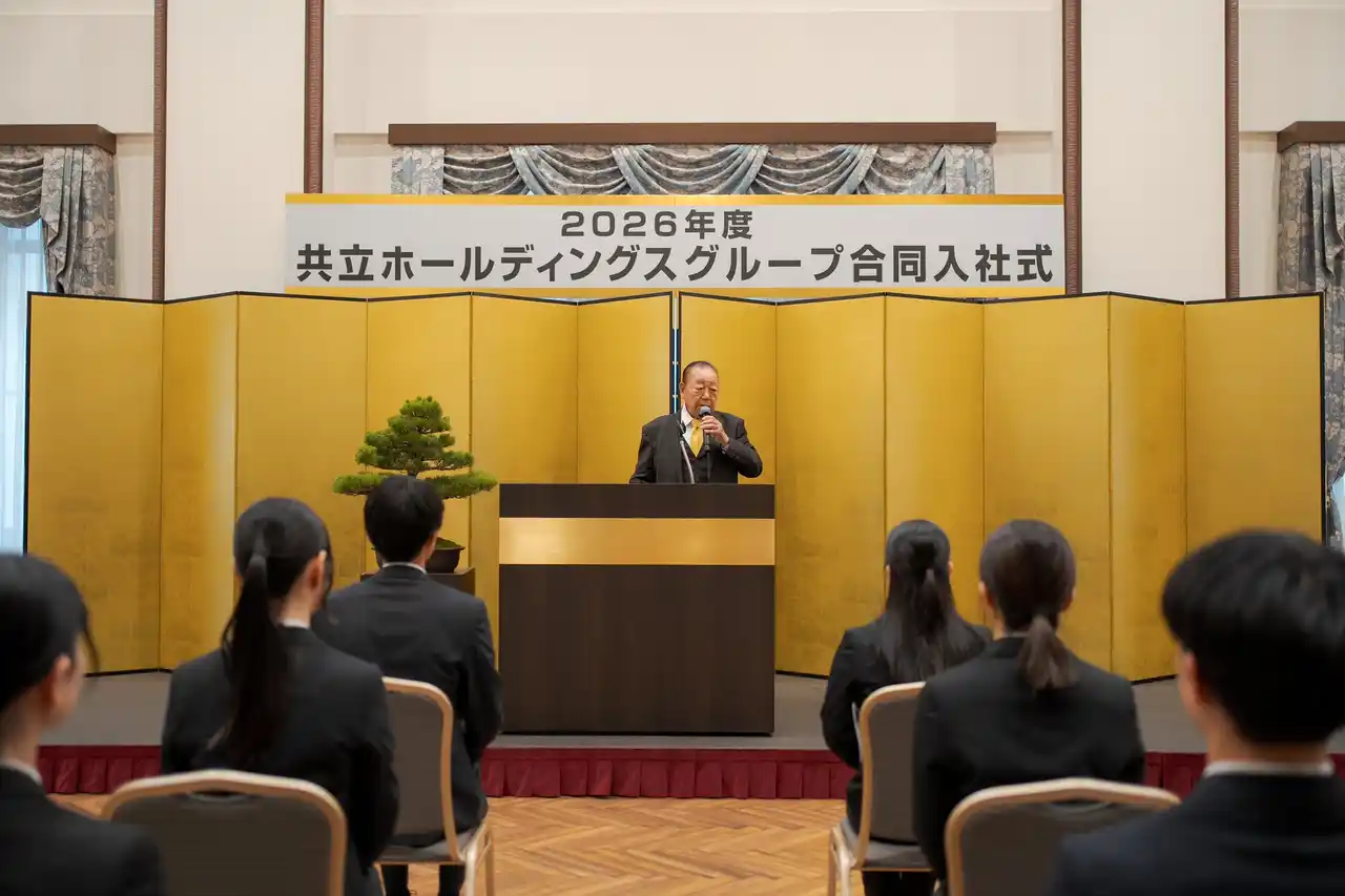 | 日本カルミック株式会社(本社:東京都千代田区、代表取締役社長:高居隆章、以下「当社」)は、2026年4月1日(水)、九段会館テラスにて共立製薬株式会社と合同で入社式を開催し、当社は9名の新入社員を迎えました。当日は会場全体が合同開催ならではの活気にあふれ、新入社員たちは真剣な面持ちで社長のメッセージに耳を傾け、社会人としての決意を新たにしていました。 | |||||||||