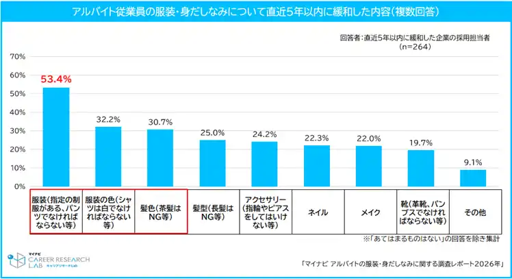 緩和した具体的な内容では、「服装」が53.4%で最も多く、「服装の色(32.2%)」「髪色(30.7%)」と続いた。 |
