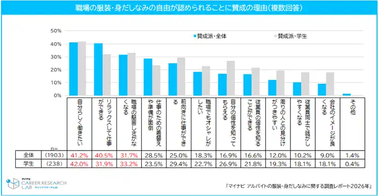 賛成理由では、全体・学生ともに「自分らしく働きたい」「リラックスして仕事ができる」「職場の堅苦しさがなくなる」が上位となった。 |