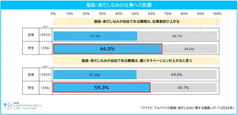 ◆学生の約6割が「服装・身だしなみが自由である職場は、応募意欲が上がる」「働くモチベーションが上がると思う」と回答 |