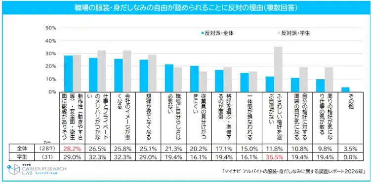 反対理由をみると、全体では「動作性(動きやすさ等)・安全面・衛生面に影響がありそう」が最多となった。一方、学生は「ふさわしい格好を選ぶ自信がない」が最も多かった。 |
