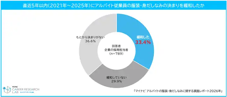 企業の採用担当者に「直近5年間(2021年~2025年)で従業員の服装・身だしなみの決まりを緩和したか」を聞いたところ、33.4%が緩和したと回答した。 |
