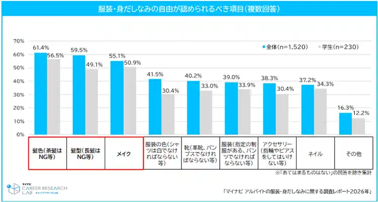 また、アルバイト就業者に、服装・身だしなみにおいて自由が認められるべきだと思う項目を聞いたところ、全体・学生ともに「髪色」「髪型」「メイク」が上位となった。【図1、2、3、4】 |