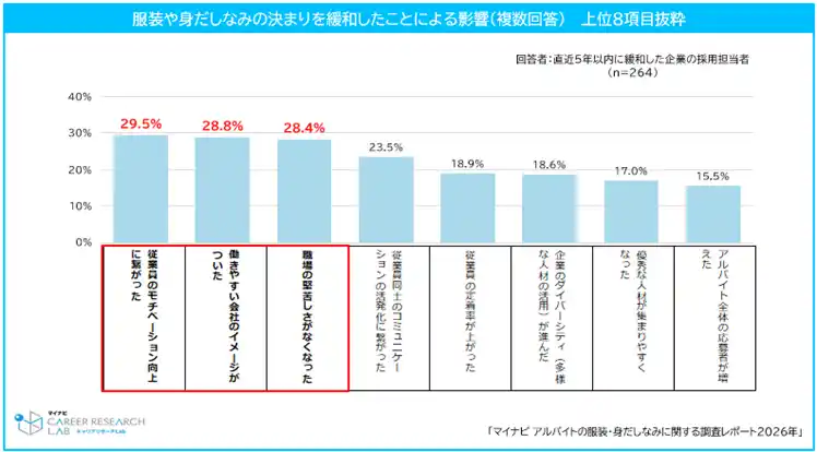 また、服装・身だしなみの決まりを緩和した影響について聞くと、良い影響では「従業員のモチベーション向上に繋がった」が29.5%で最も多く、「働きやすい会社のイメージがついた」「職場の堅苦しさがなくなった」と続いた。【図6、7、8】 |