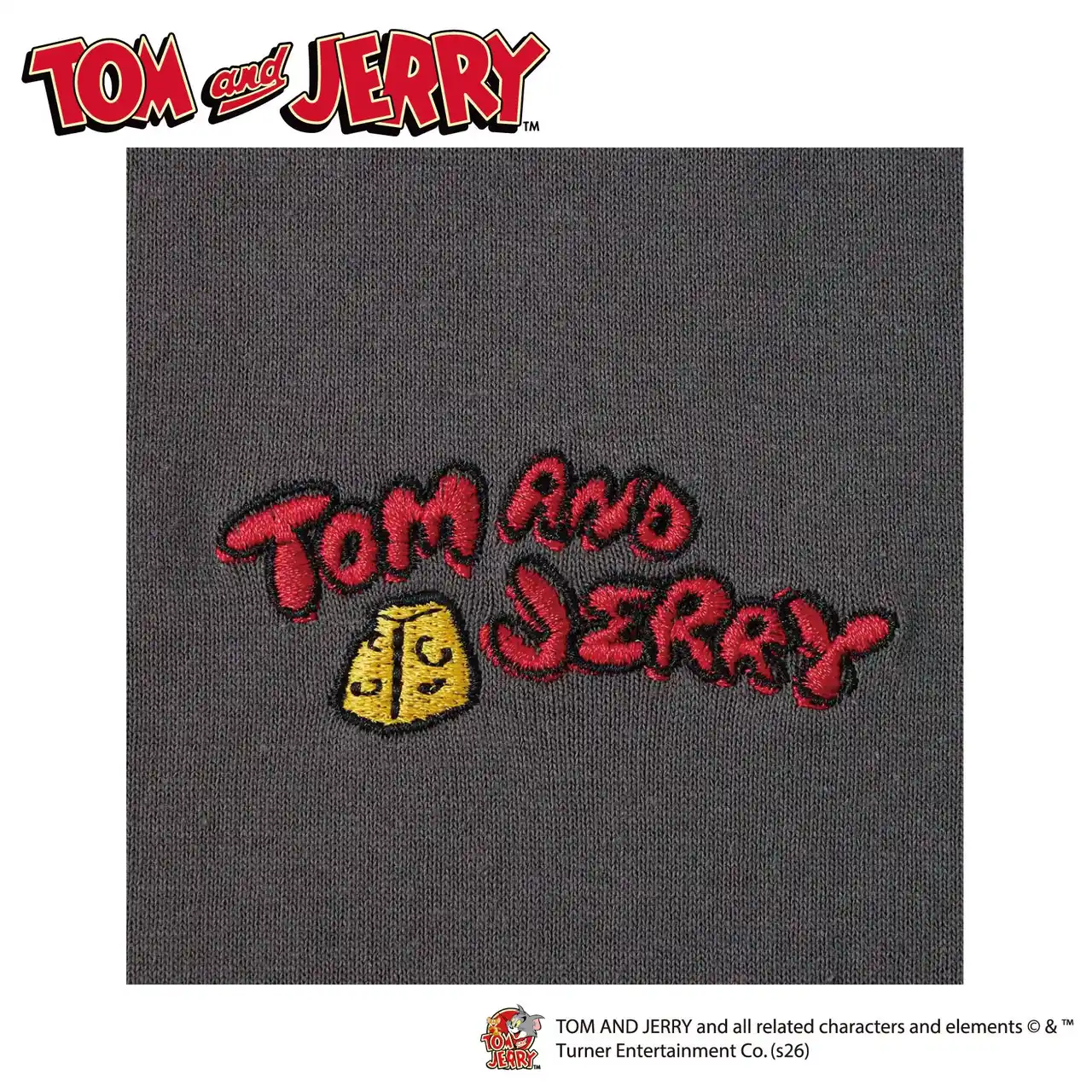 商品特長:フロントにロゴ刺繡、バックにトム、ジェリー、タフィーのイラストの刺繍をあしらいました。