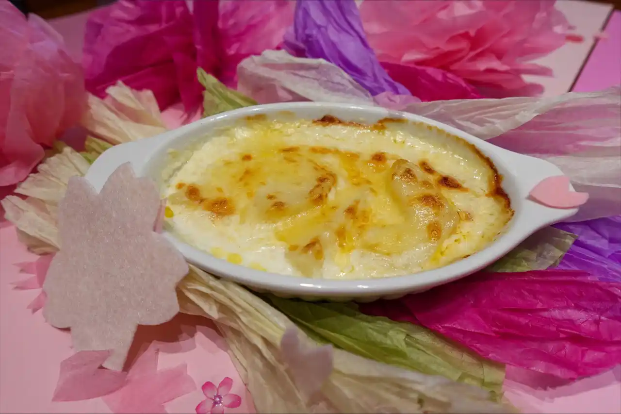 ジャガイモは北海道産男爵いもを約6mmのスライスにし、牛乳・生クリーム・バターを使ったソースでじっくり煮込みながらとろみをつける製法を採用しています。ジャガイモの火の入り方とソースの濃度を見極めながら仕上げる工程が、味の決め手となります。富良野産玉ねぎは、昼夜の寒暖差が大きい気候の中で育つため、加熱すると甘みが引き立つのが特徴です。本メニューでは、その玉ねぎを使用することで、にんにくの香りとともにソース全体に深みを与え、北海道産牛乳や生クリームのコクと調和した、やさしい味わいに仕上げています。