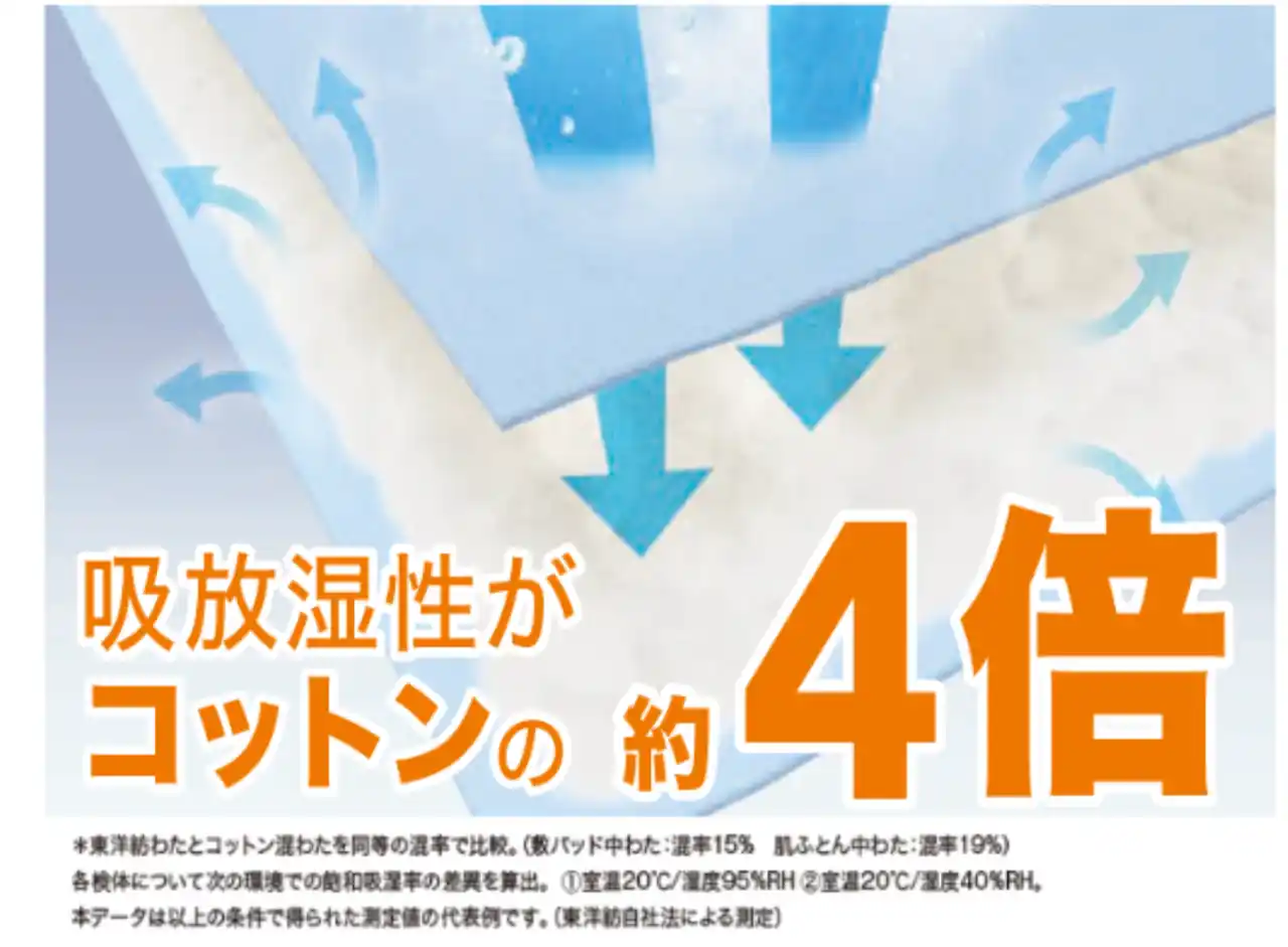 また、ムレを軽減する東洋紡の除湿わたを採用しています。寝ている間に湿気をコントロールし放湿してくれるので、ムレ感なく快適にご使用いただけます。 |
