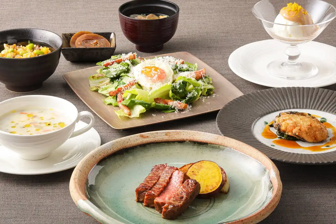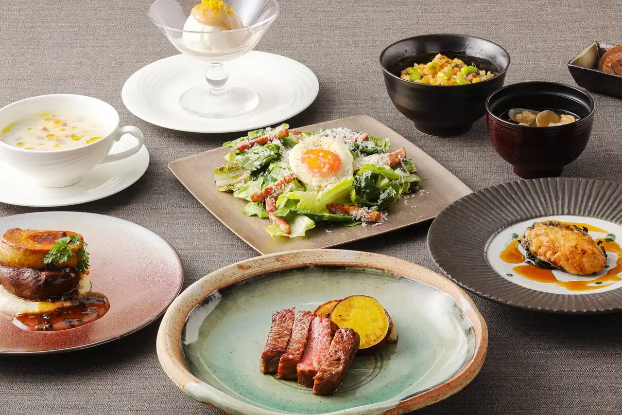 オールデイダイニング「SATSUKI」の「千葉県産牡蠣のアヒージョ」や、日本料理「千羽鶴」の「江戸前穴子と新牛蒡の柳川」、中国料理「大観苑」の「鴨川産青パパイヤとビーフンの和え物」など、各料理長が厳選した地産食材が目白押し。ホテル最上階からの絶景を望む鉄板焼「欅」では、「国産牛サーロインステーキ」をメインに、シェフが目の前で焼き上げる臨場感溢れるランチコースをお愉しみいただけます。(※欅はランチタイム限定) |