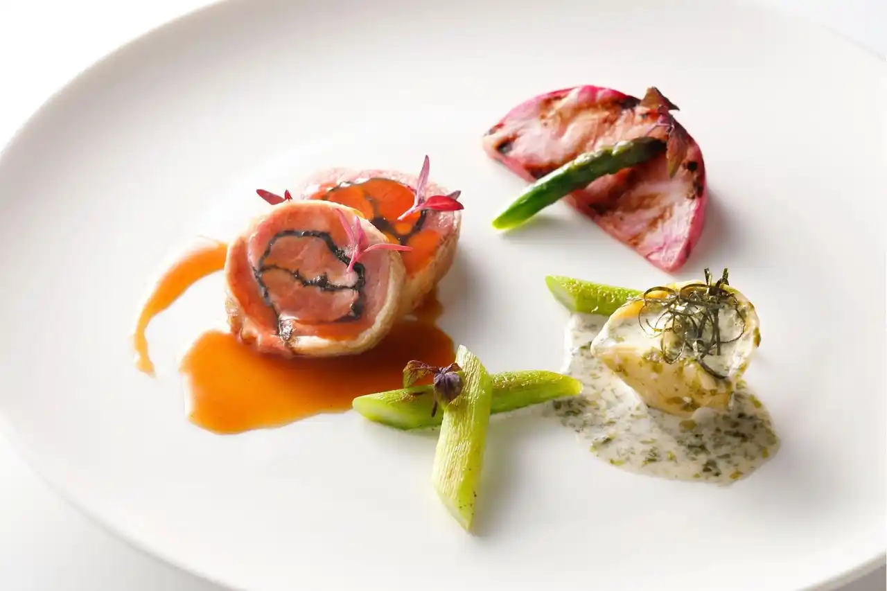 中国料理「大観苑」の目玉は、房総金目鯛を異なる味わいで愉しむ「房総金目鯛二種の味わい ホワイトチリソースとパッションフルーツマヨネーズ」。上総牛の柔らか煮など、厳選食材を意外な組み合わせで楽しむ、ここでしか出会えない“ちば中華”が並びます。 |