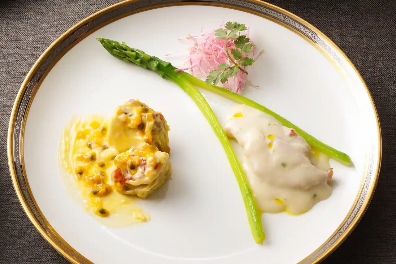 房総金目鯛二種の味わい ホワイトチリソースとパッションフルーツマヨネーズ(大観苑) |