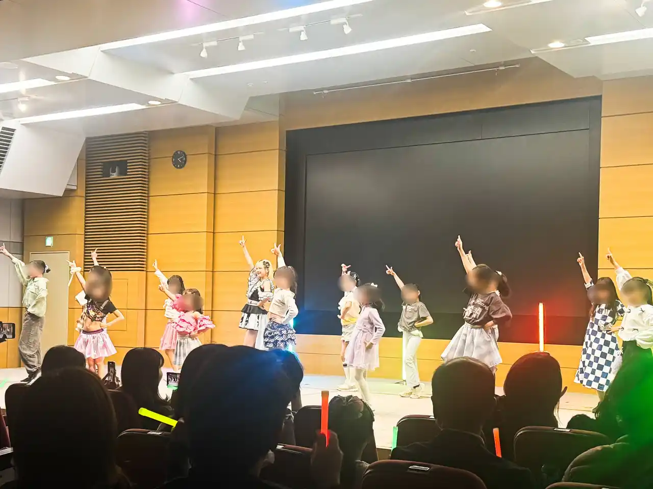 | レッスン後には、アイドルと一緒にステージへ登場し、観客の前で堂々としたパフォーマンスを披露。観覧していた社員や保護者からは大きな拍手が送られ、会場は大きな拍手と笑顔に包まれました。 | |||||||||