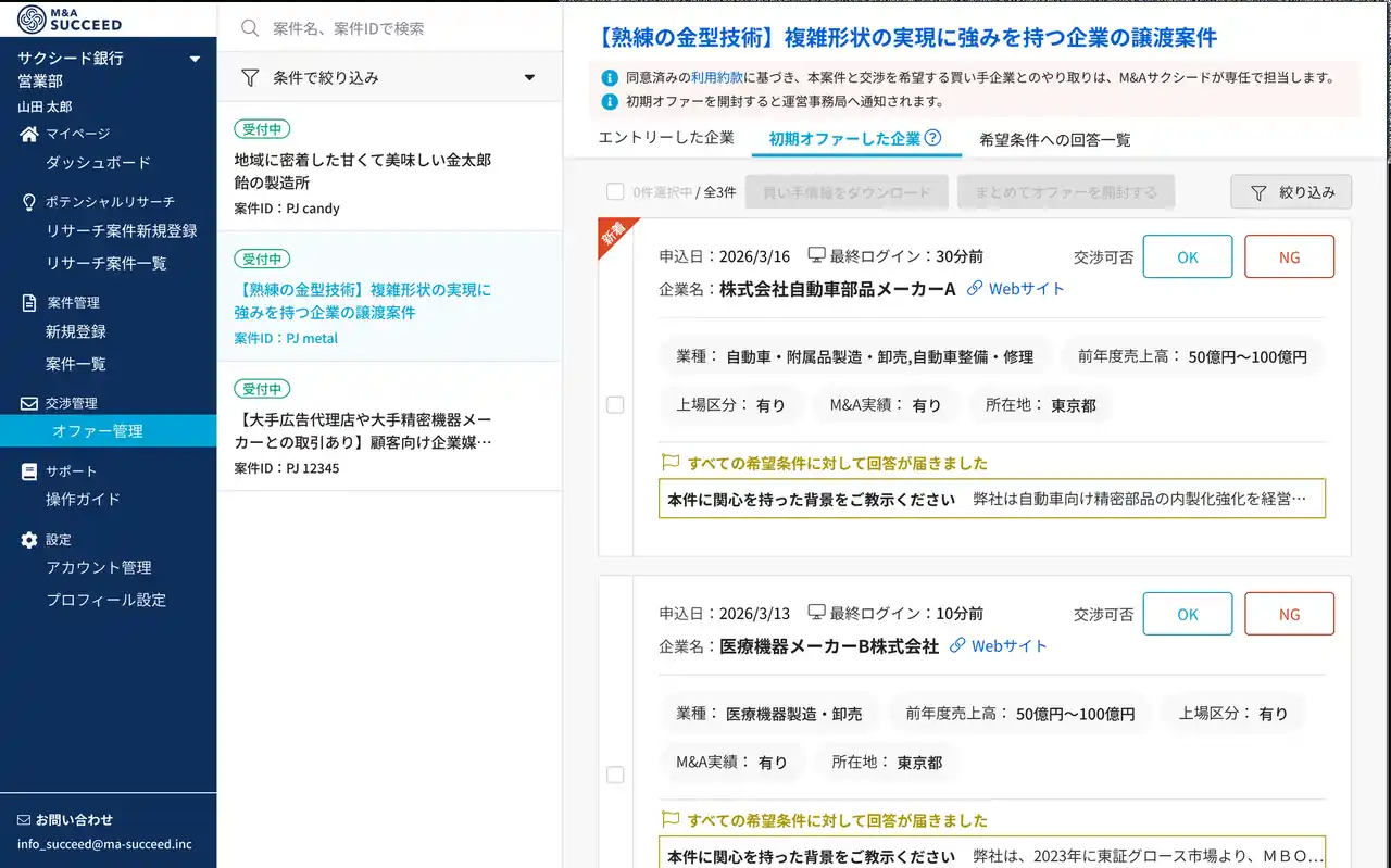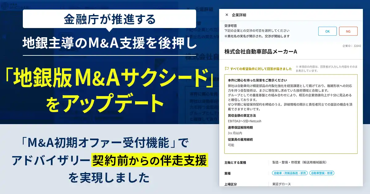 Visionalグループの株式会社M&Aサクシード(所在地:東京都渋谷区/代表取締役社長:金 蓮実)が運営する法人限定M&Aプラットフォーム「M&Aサクシード」(https://ma-succeed.jp/)は、地域金融機関向けに提供している「地銀版M&Aサクシード」をアップデートし、2026年4月7日より新たに「M&A初期オファー受付機能」の提供を開始いたします。 |