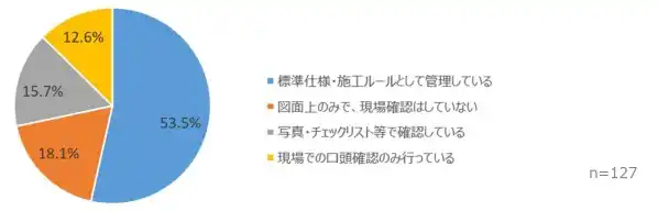 「壁体内・屋根の通気層について、施工段階での確認・管理を行っているか?」を尋ねたところ、「写真やチェックリストで確認している」「標準仕様として管理している」といった回答がある一方、「図面上のみで現場確認はしていない」「口頭確認にとどまっている」とする回答も見られました。通気層は完成後に確認することが難しいため、施工中の確認や記録の重要性が改めて浮き彫りとなりました。