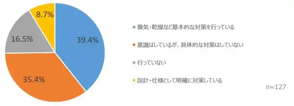 「基礎コンクリートの水分が室内環境に影響することを意識し、対策を行っているか?」との問いには、約4割が対策を行っていましたが、「意識はしているが具体的な対策はしていない」という回答も35.4%見られました。「設計や仕様として明確に対策している」とする事業者は8.7%にとどまっています。