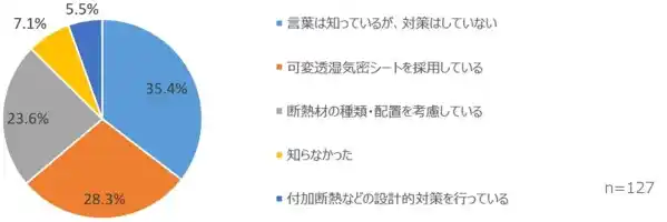 「冷房期に発生する『夏型結露』について、どのレベルで認識・対応しているか?」との問いには、「言葉は知っているが対策はしていない」「知らなかった」とする回答が合わせて4割を超えました。一方で、断熱材の種類や配置を工夫したり、付加断熱などの設計的対策を行ったりしている事業者も存在します。
