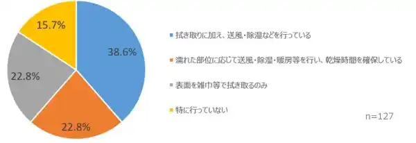 「新築住宅の施工中、雨などで躯体を濡らしてしまった場合、どのような対応を行っているか?」との問いに対して、「送風や除湿、暖房などを組み合わせて乾燥させている」とする回答がある一方で、「特に何もしていない」「表面を拭き取るのみ」といった回答が約4割を占めました。