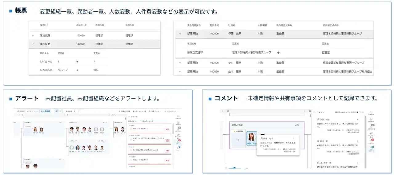 | 実務運用面においても、組織原案の作成から、組織図の参照・検索・メンテナンス、画面上での人員配置シミュレーション、関係者との共有や共同編集に至るまで、一連の業務プロセスをCTM2.0上で完結させることで、組織・異動検討業務の効率化を図っていく考えです。 | |||||||||