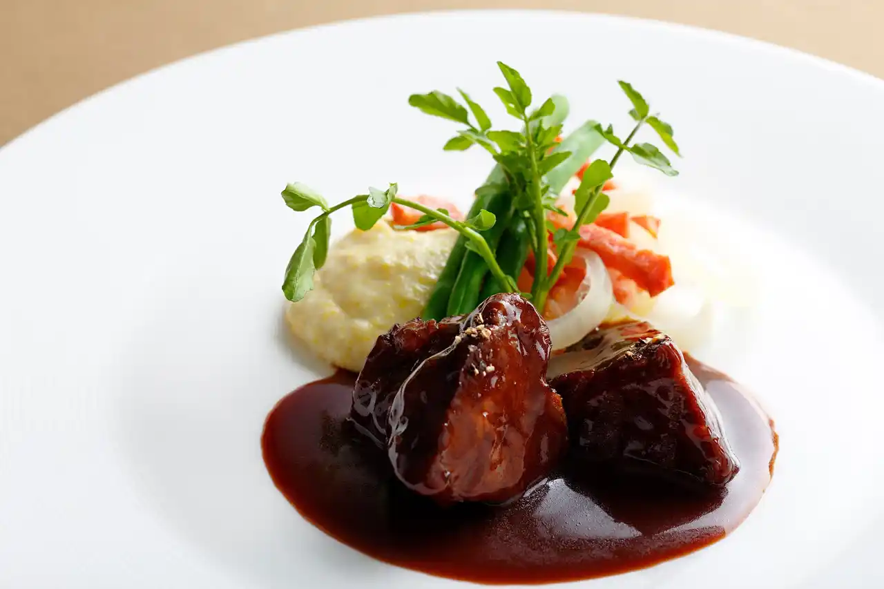 <肉料理> 国産牛肉の赤ワイン煮込みとポレンタ |