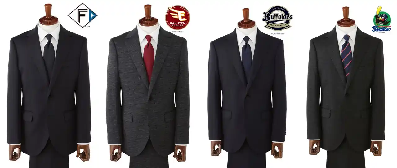 青山商事株式会社(本社:広島県福山市/代表取締役社長:遠藤 泰三)は、オフィシャルスーツサプライヤーとして提供しているプロ野球4球団(北海道日本ハムファイターズ、東北楽天ゴールデンイーグルス、オリックス・バファローズ、東京ヤクルトスワローズ)の公式スーツをフルモデルチェンジいたします。これを記念し、監督・コーチ・選手が遠征や公式行事で実際に着用するスーツと同素材・同型の「レプリカモデル」を、4月7日(火)より各球団の本拠地を中心とした「洋服の青山」限定店舗および公式オンラインストアにて数量限定で発売します。 |