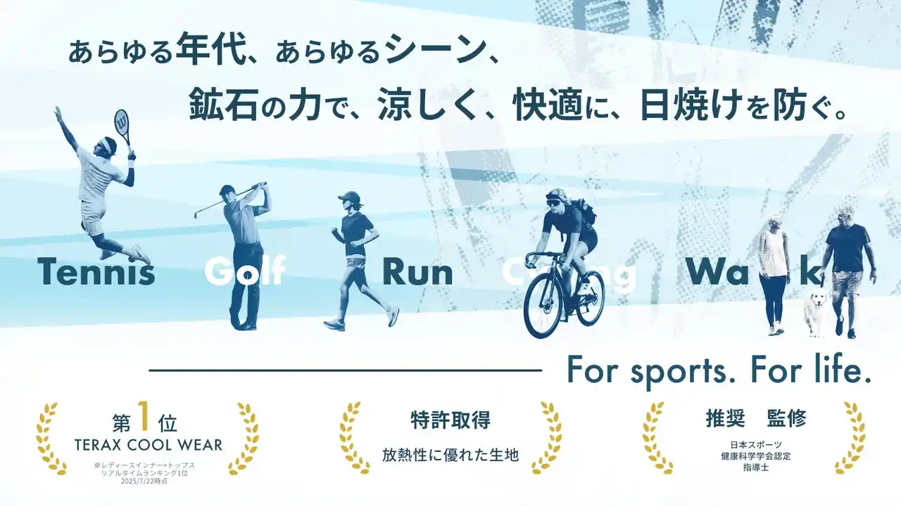 屋外スポーツ、ランニング、テニス、ウォーキング、ヨガなど、多くの“動くシーン”で求められるのは「動きやすい」「涼しい」「紫外線から守れる」 という3要素。 |