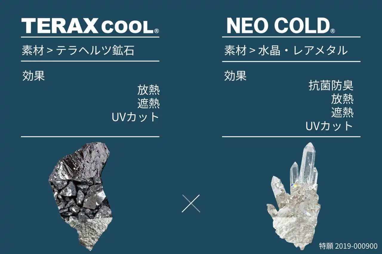 NEO COLD(R)は主成分に水晶を用い、プリントが透明で生地になじみやすく、放熱・遮熱・抗菌防臭などの機能を持つ素材です。 |