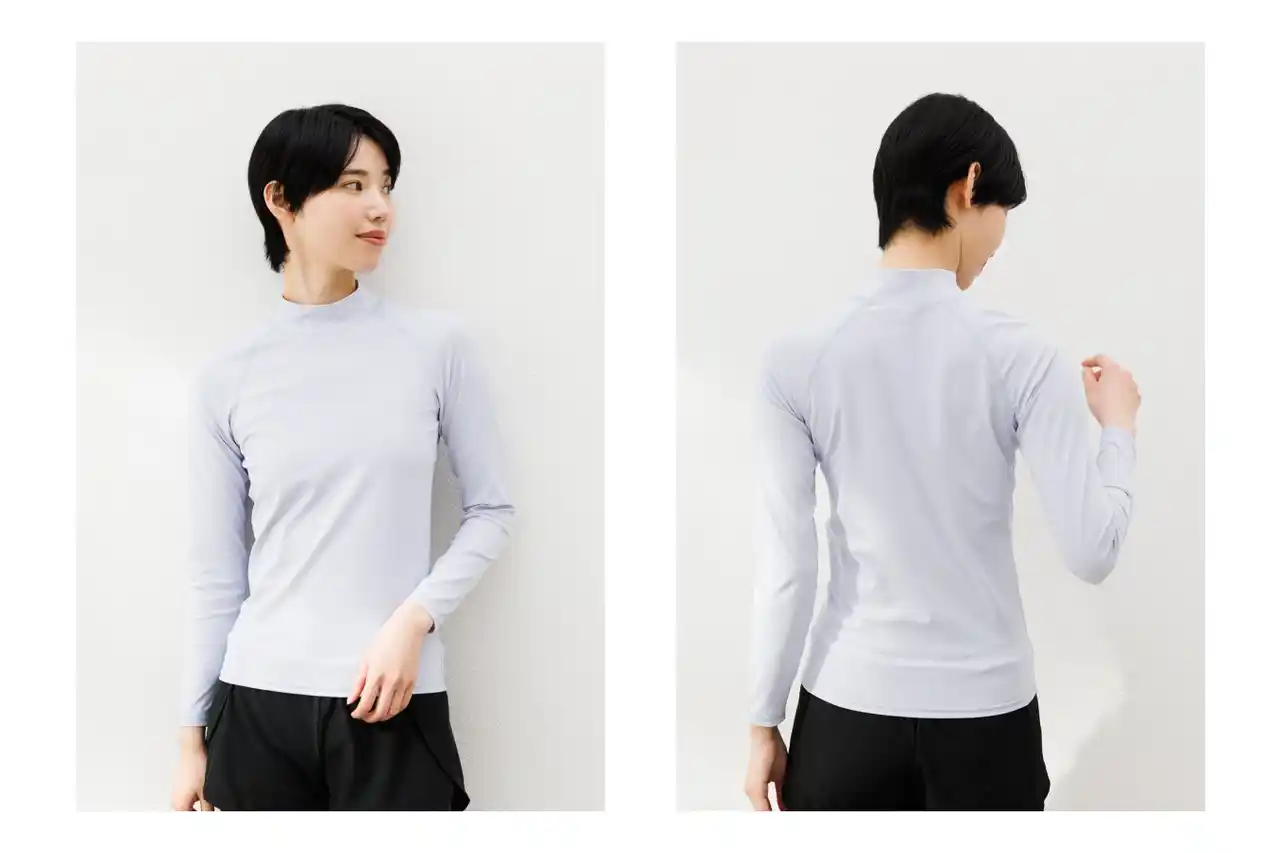 首元までカバーできるハイネック仕様。 屋外スポーツや日差しの強い環境でも快適に動ける、 長袖アクティブウェアです。 |